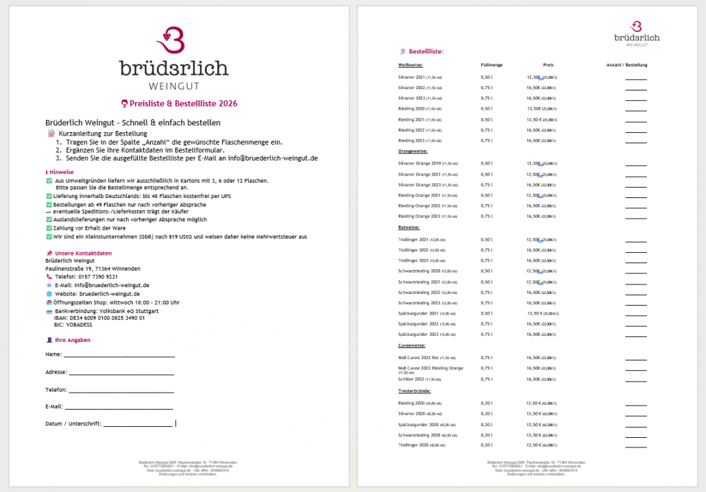 Unsere aktuelle Preisliste und Bestellliste (Weinkarte) steht Ihnen als PDF zum Download zur Verfügung.